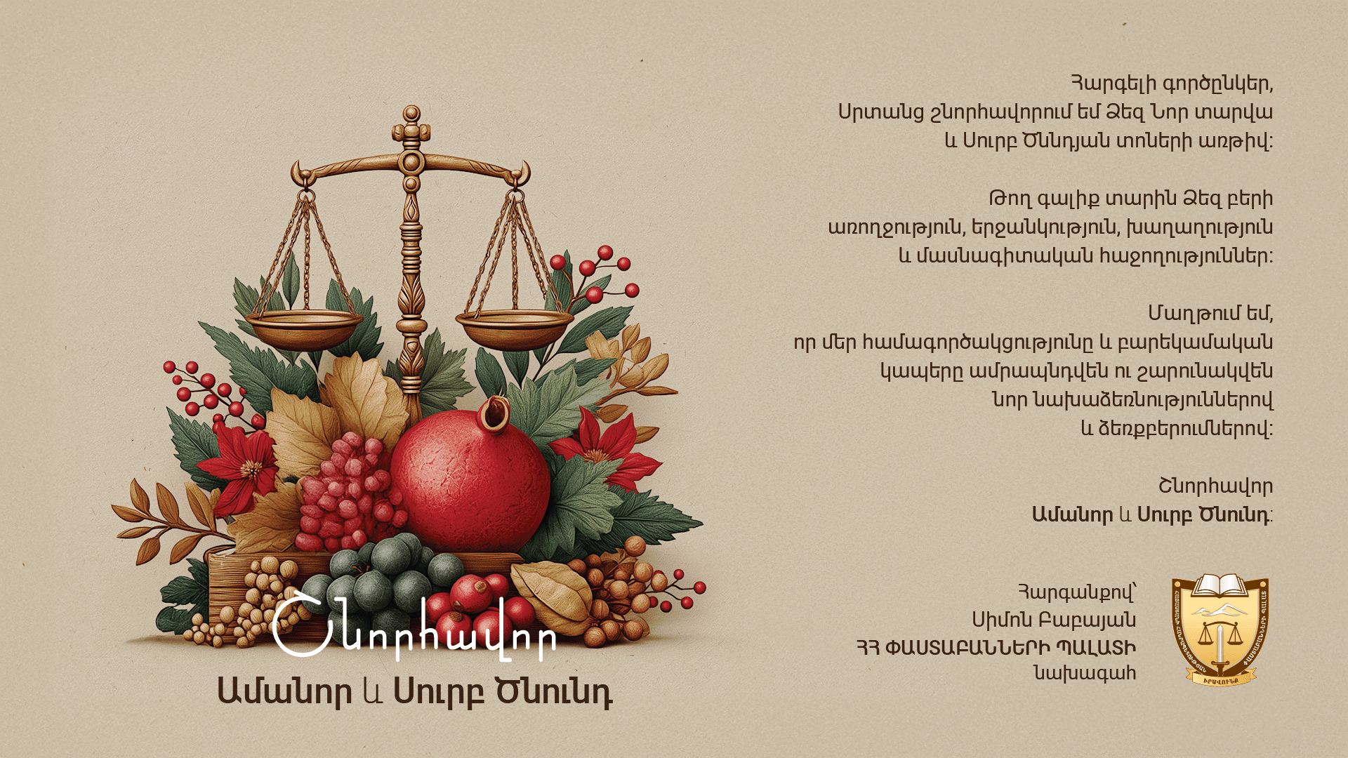 Թող գալիք 2026 թվականը լինի հոգևոր արժեքների և հավատքի ամրապնդման, մեր ազգային ինքնության վերարժևորման, նոր նվաճումների և վերելքների տարի, ապրենք խաղաղ և անվտանգ հայրենիքում՝ ծառայելով հանրության իրավագիտակցության բարձրացման և քաղաքացիների իրավունքների պաշտպանության արդար նպատակին: